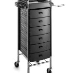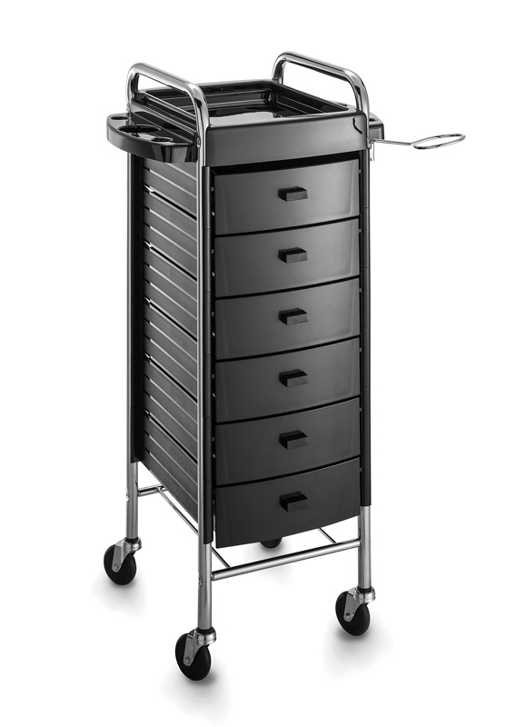 Тележка парикмахерская закрытого типа на хромированном каркасе из прочного пластика с шестью выдвижными ящиками. Оснащена прорезиненными колесами для комфортного и бесшумного перемещения, металлическим фенодержателем и боковыми полками с отделениями для сопутствующих аксессуаров.