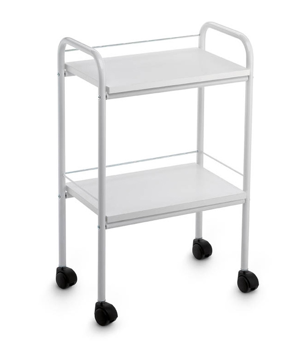 Тележка из окрашенного металла с 2-мя большими полками и верхними ручками для удобного перемещения, на колесиках.