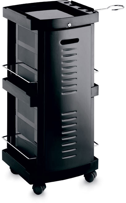 Тележка парикмахерская закрытого типа из прочного пластика с шестью выдвижными ящиками. Тележка закрывается противоскользящей панелью с ключом. Оснащена боковыми ограждениями, металлическим фенодержателем, отверстиями под кисти и отделениями под сопутствующие аксессуары.