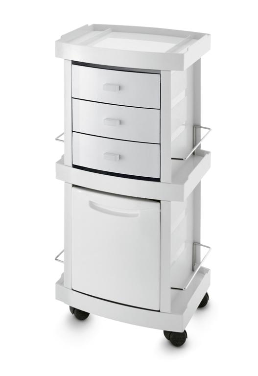 Тележка парикмахерская выполнена из пластика, на колесиках. Оснащена тремя малыми и одним большим выдвижными ящиками закрытого типа, а также боковыми полочками и держателями для аксессуаров.
