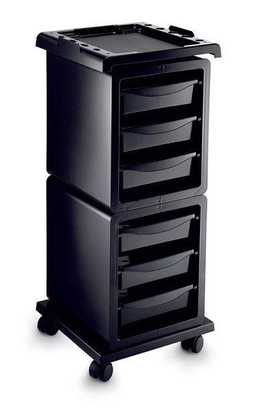 Тележка парикмахерская из прочного пластика на колесах. Имеет 6 выдвижных ящиков, боковые отделения под кисти и сопутствующие аксессуары, металлический фенодержатель.