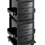 Тележка парикмахерская из прочного пластика закрытого типа на колесах. Оснащена боковыми лотками, которые регулируются по высоте. Имеет боковые отверстия под кисти и сопутствующие аксессуары, а также металлический фенодержатель.