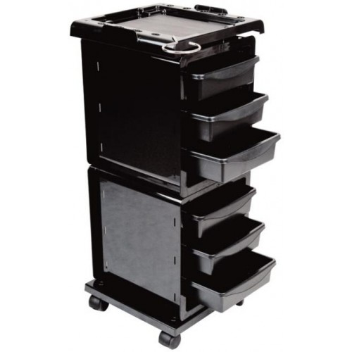 Тележка парикмахерская из прочного пластика на колесах. Имеет 6 выдвижных ящиков, боковые отделения под кисти и сопутствующие аксессуары, а также металлический фенодержатель.