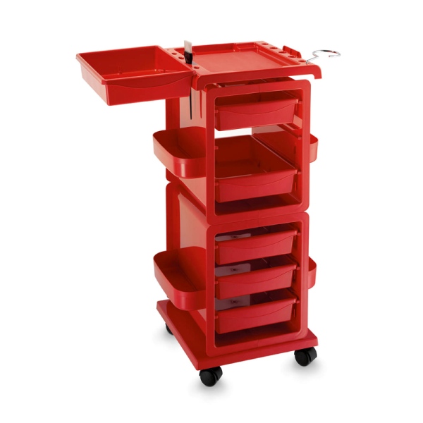 Тележка парикмахерская из прочного пластика на колесах. Оснащена боковыми лотками, которые регулируются по высоте. Также тележка имеет металлический фенодержатель и отделения под кисти и сопутствующие аксессуары.