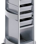 Тележка парикмахерская из прочного пластика на колесах с четырьмя выдвижными ящиками. В нижней части тележки есть отделение для сумок. Имеет металлический фенодержатель, 2 отделения под миски для окрашивания и отверстия под кисти. Также тележка оснащена боковыми отделениями под сопутствующие аксессуары.