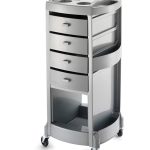 Тележка парикмахерская выполнена из прочного пластика. Тележка оснащена четырьмя выдвижными ящиками закрытого типа, прорезиненными колесами диаметром 70 мм, а также столешницей с отверстиями под миски для окрашивания. На задней и боковых частях тележки расположены отсеки для хранения флаконов. В нижней части тележки предусмотрена ниша для хранения полотенец и других инструментов.