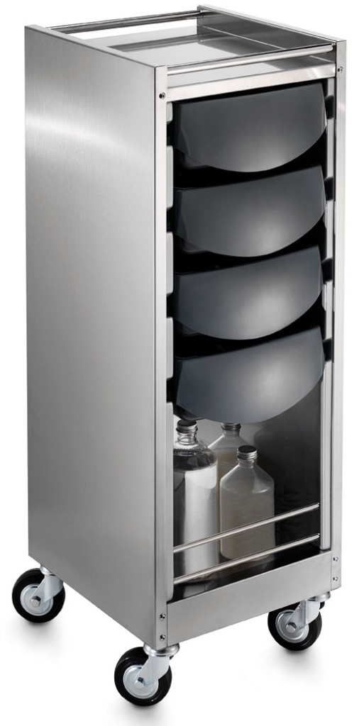 Тележка парикмахерская с покрытием из хромированного металла. Имеет 4 выдвижных пластиковых ящика и отделение для хранения шампуней. Оснащена прорезиненными колесами для комфортного и бесшумного перемещения.