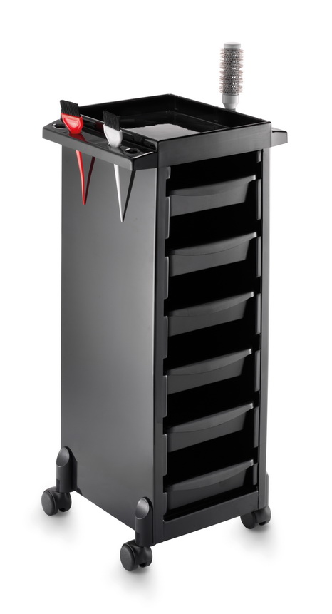 Тележка парикмахерская из прочного пластика на колесах с шестью выдвижными ящиками. Оснащена боковыми отделениями под кисти и сопутствующие аксессуары.
