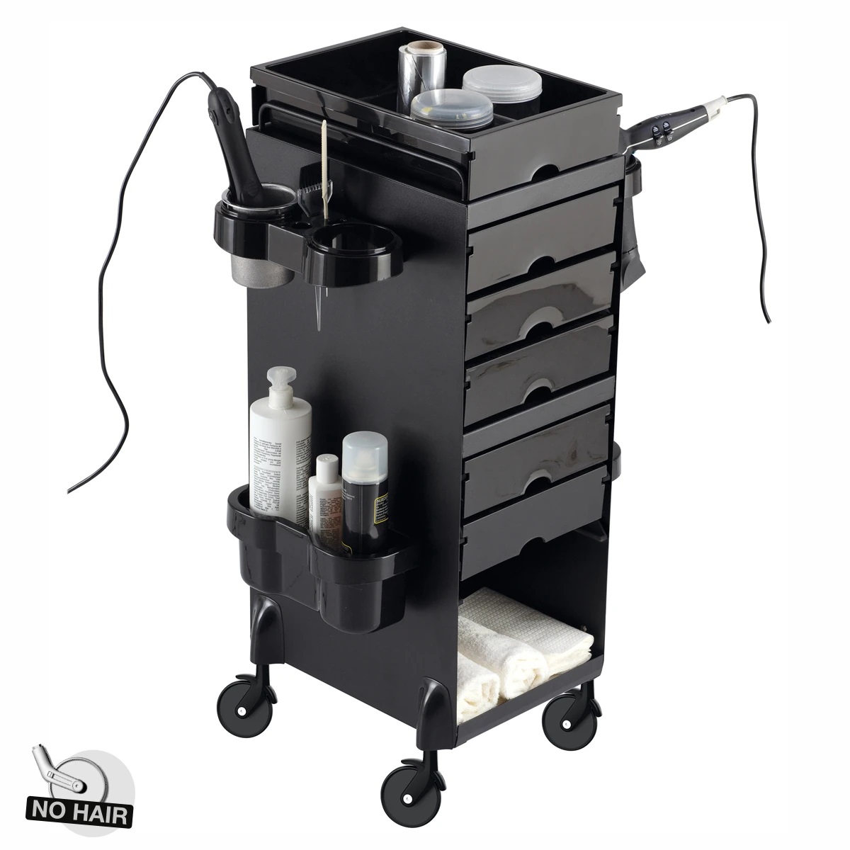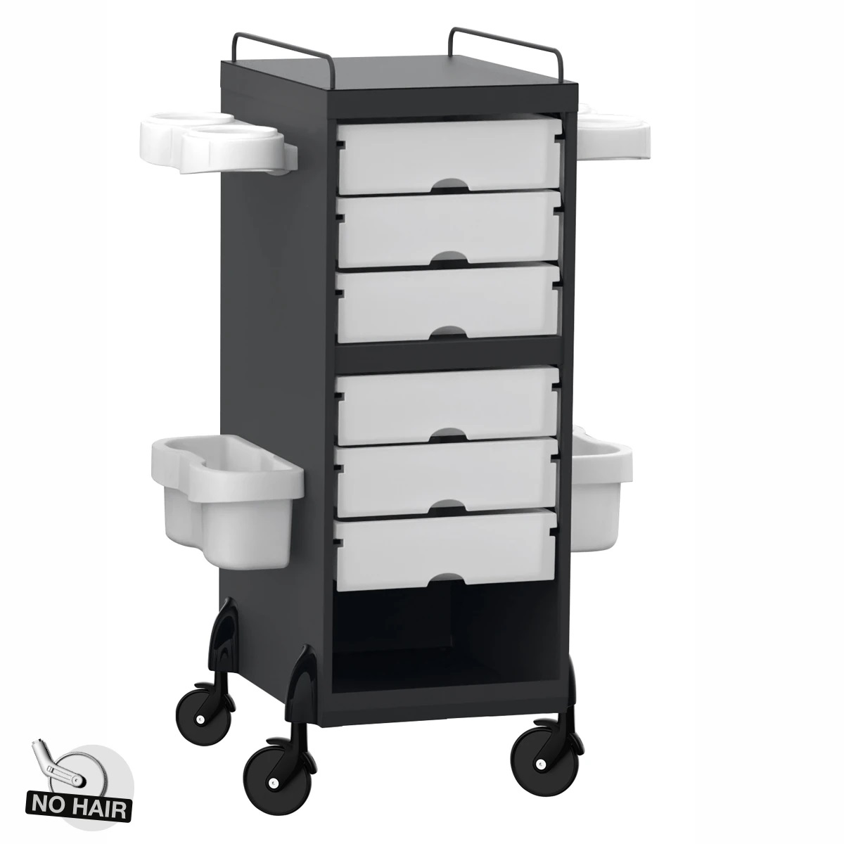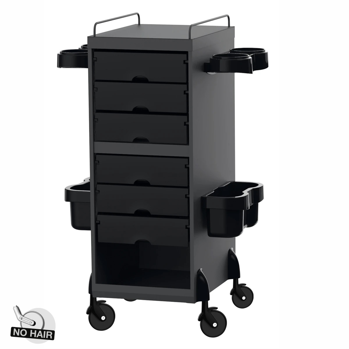 Тележка парикмахерская на бесшумных колесиках «NO HAIR». Тележка выполнена из металла. Тележка оснащена шестью выдвижными ящиками, съемными боковыми полками, предназначеными для размещения фена и нишей для хранения инструментов.