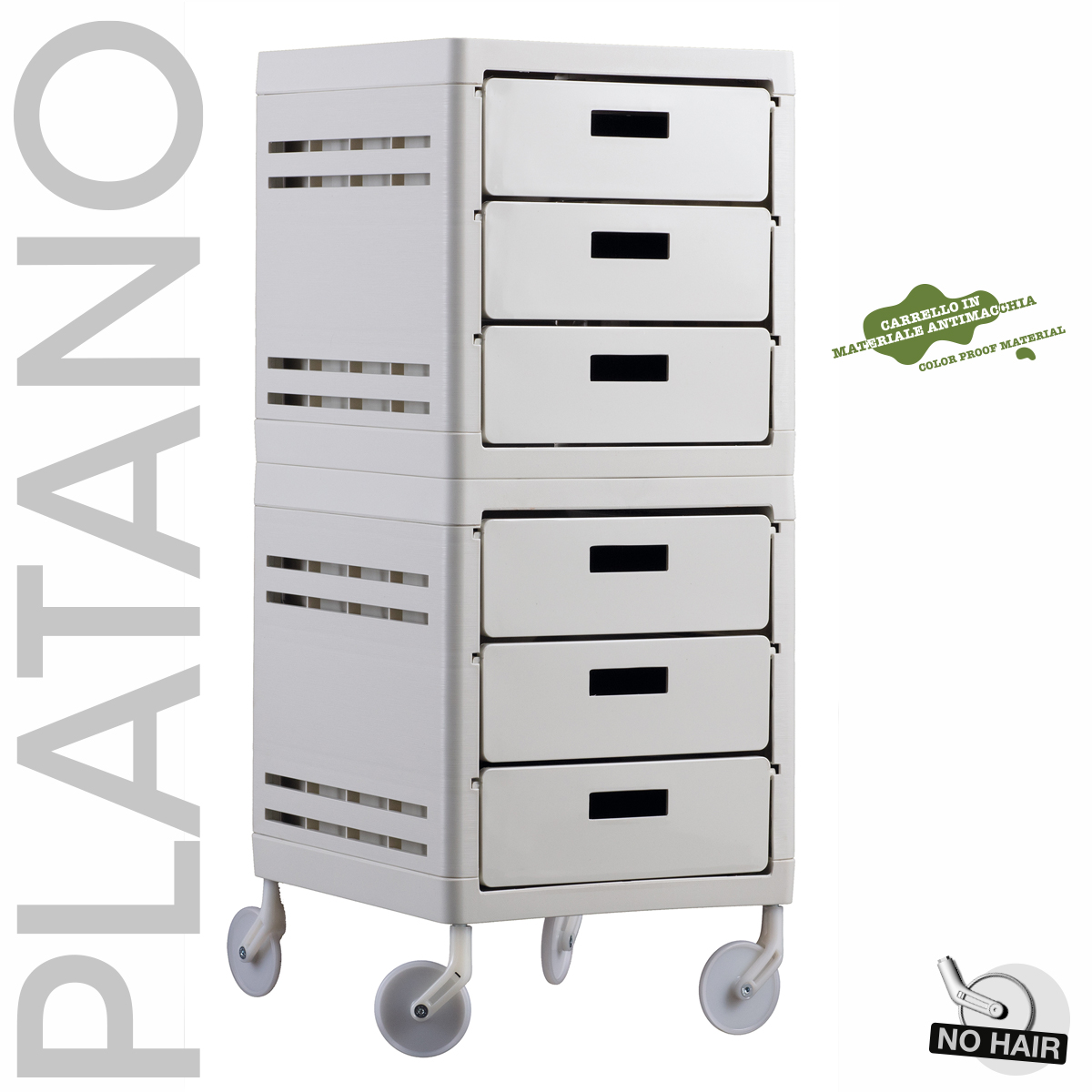 Тележка парикмахерская закрытого типа на бесшумных колесиках «NO HAIR». Тележка выполнена из переработанного пластика. Тележка оснащена выдвижными ящиками и съемными боковыми полками.