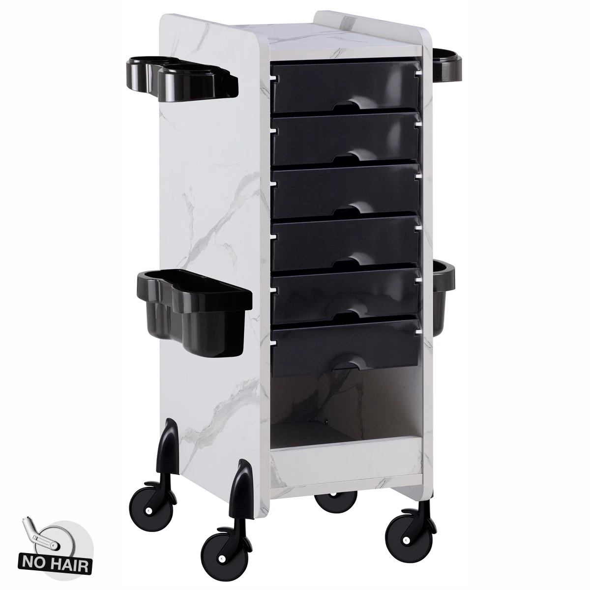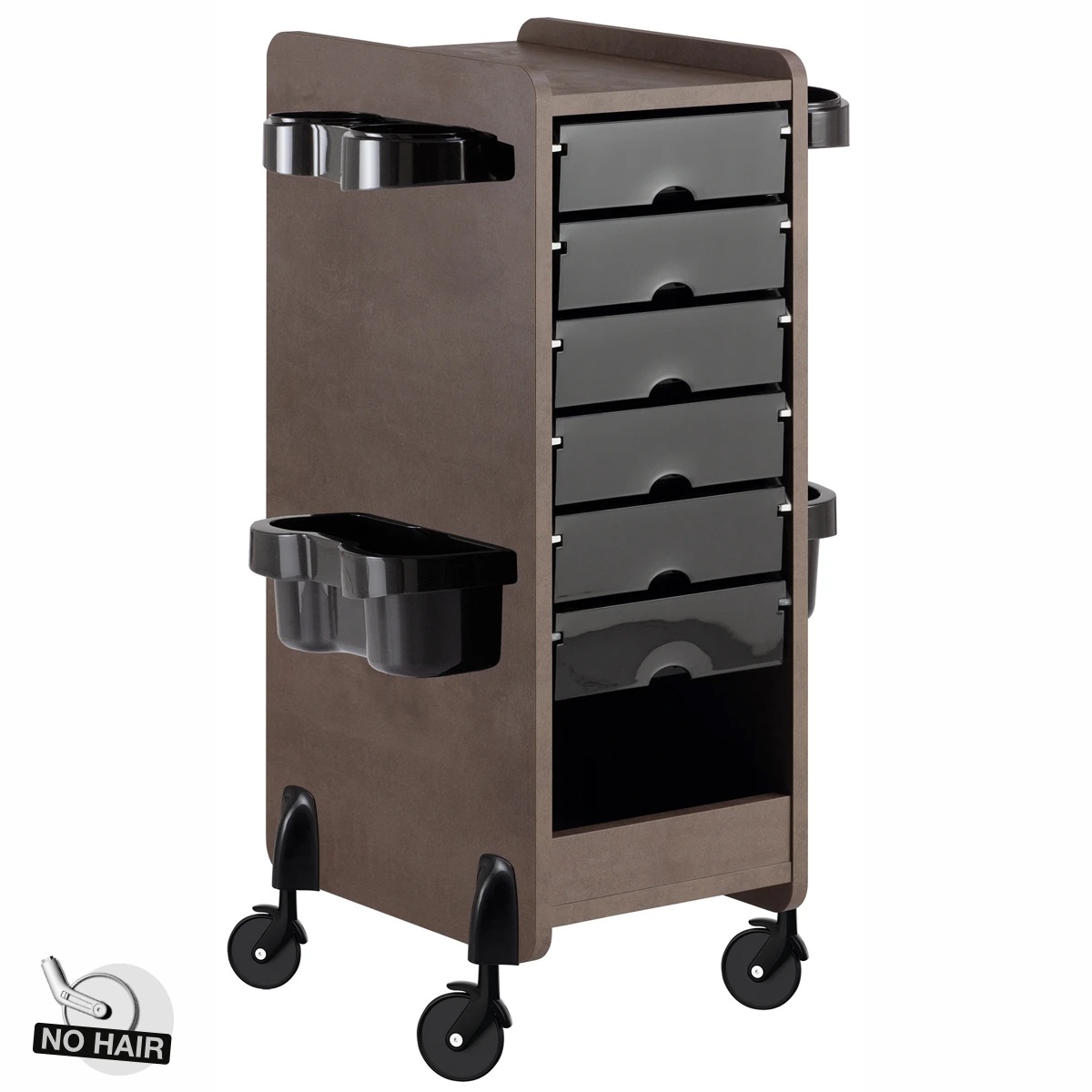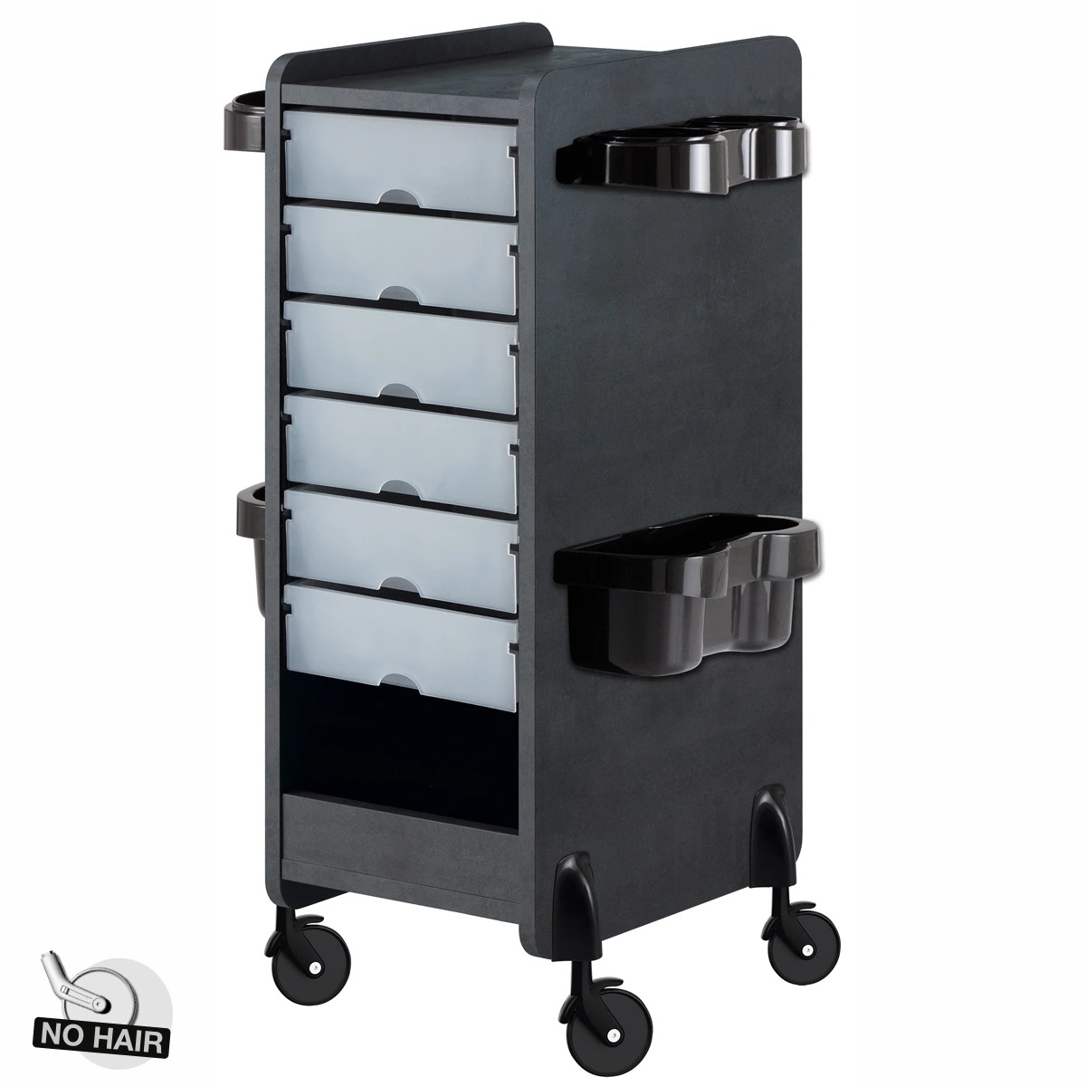 Тележка парикмахерская на бесшумных колесиках «NO HAIR». Тележка выполнена из ламината. Тележка оснащена шестью выдвижными ящиками, съемными боковыми полками, предназначеными для размещения фена и нишей для хранения инструментов.