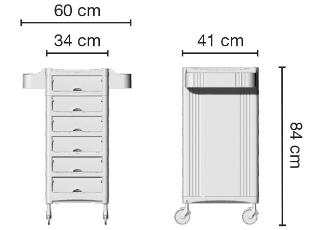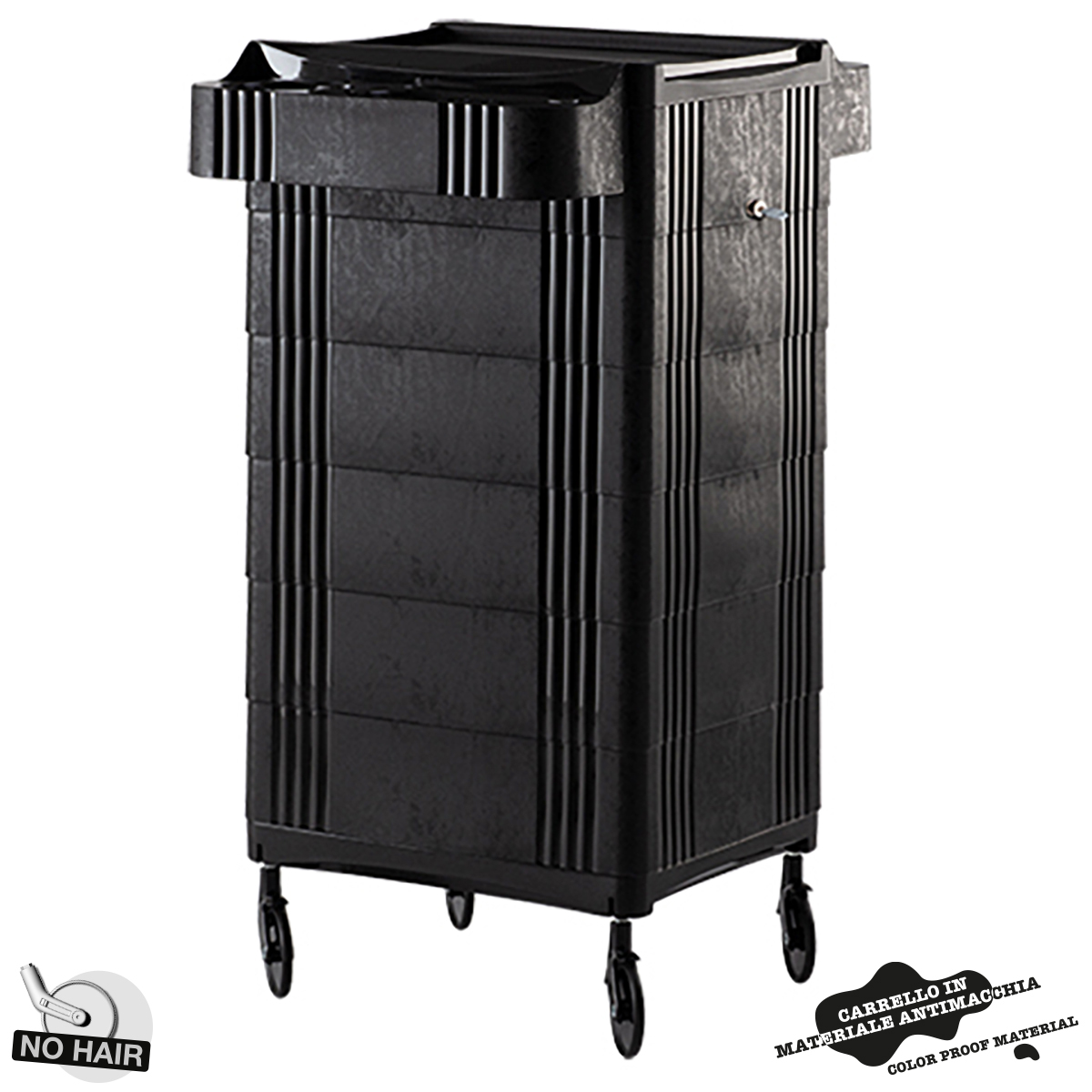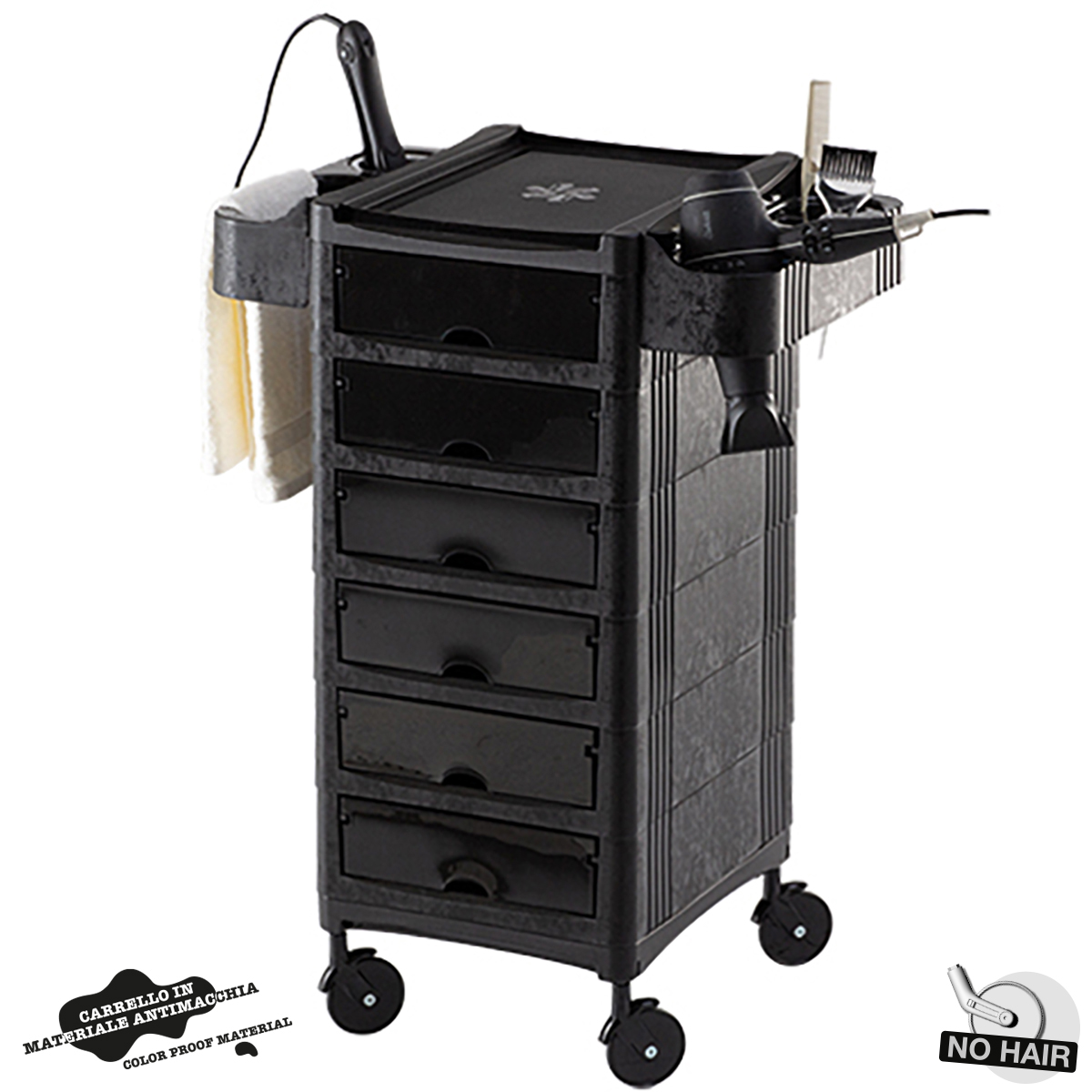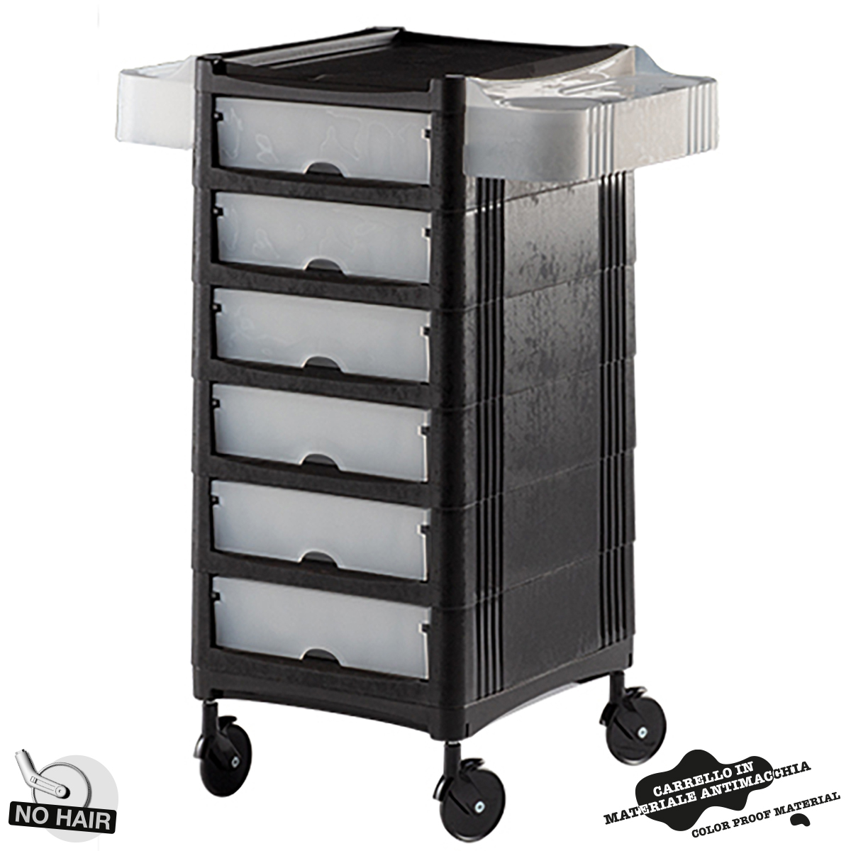 Тележка парикмахерская на бесшумных колесиках «NO HAIR». Тележка выполнена из прочного пластика черного цвета. Тележка оснащена шестью выдвижными ящиками, съемными боковыми полками, предназначеными для размещения фена и хранения инструментов.