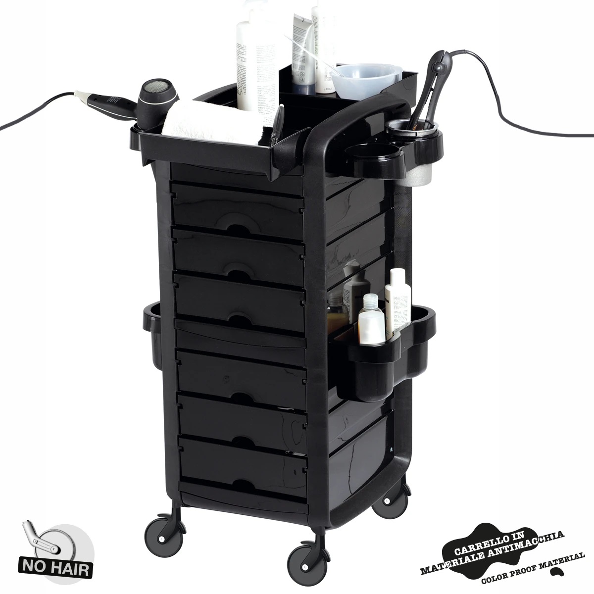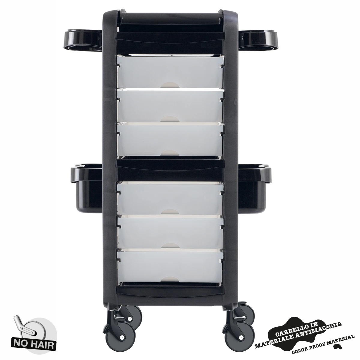 Тележка парикмахерская на бесшумных колесиках «NO HAIR». Тележка выполнена из прочного пластика. Тележка оснащена шестью выдвижными ящиками, съемными боковыми полками, предназначеными для хранения инструментов, открываемыми верхними дверцами для создания функциональной столешницы.