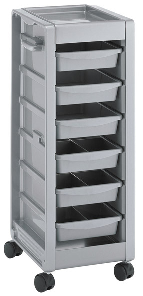 Тележка парикмахерская из пластика на колесах. Имеет 6 выдвижных ящиков, каждый из которых можно закрепить на боковых стенках тележки.