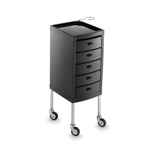 Тележка парикмахерская закрытого типа из пластика с шестью выдвижными ящиками. Оснащена прорезиненными колесами для комфортного и бесшумного перемещения, имеет металлический фенодержатель.