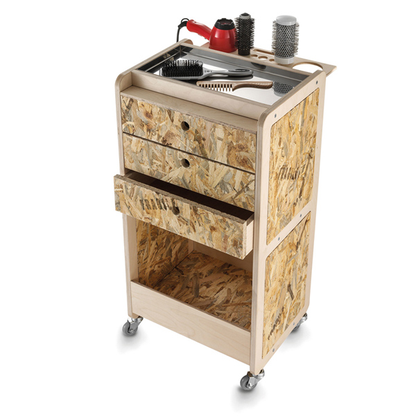 Тележка парикмахерская на прорезиненных колесах для комфортного и бесшумного перемещения выполнена из натурального дерева. В верхней части тележки расположен съёмный металлический лоток для горячих инструментов, 2 отделения под фен и отверстия под кисти и сопутствующие аксессуары. Тележка имеет три выдвижных ящика, в нижней части расположено отделение для хранения шампуней.