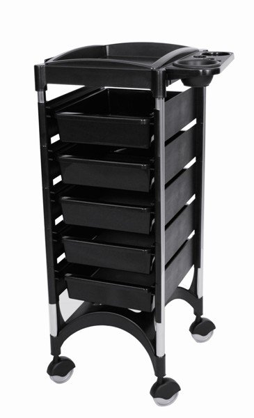 Тележка парикмахерская выполнена из пластика черного цвета, на колесиках, с выдвижными ящиками. Тележка оснащена отверстием для фена.