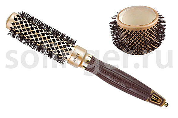 Термобрашинг на пластиковой основе с нейлоновой щетиной. Алюминиевая втулка с керамическим покрытием. Волнистая щетина. Разделитель прядей.