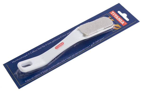 Тёрка для сухой кожи ног с изогнутой ручкой из высококачественной стали.