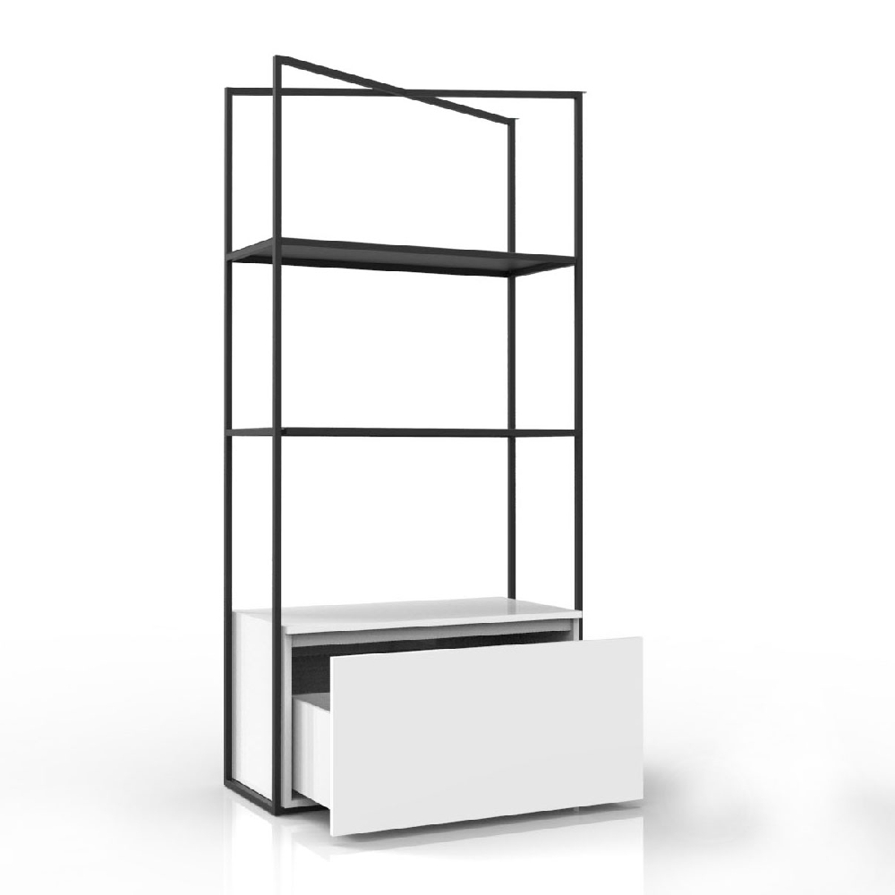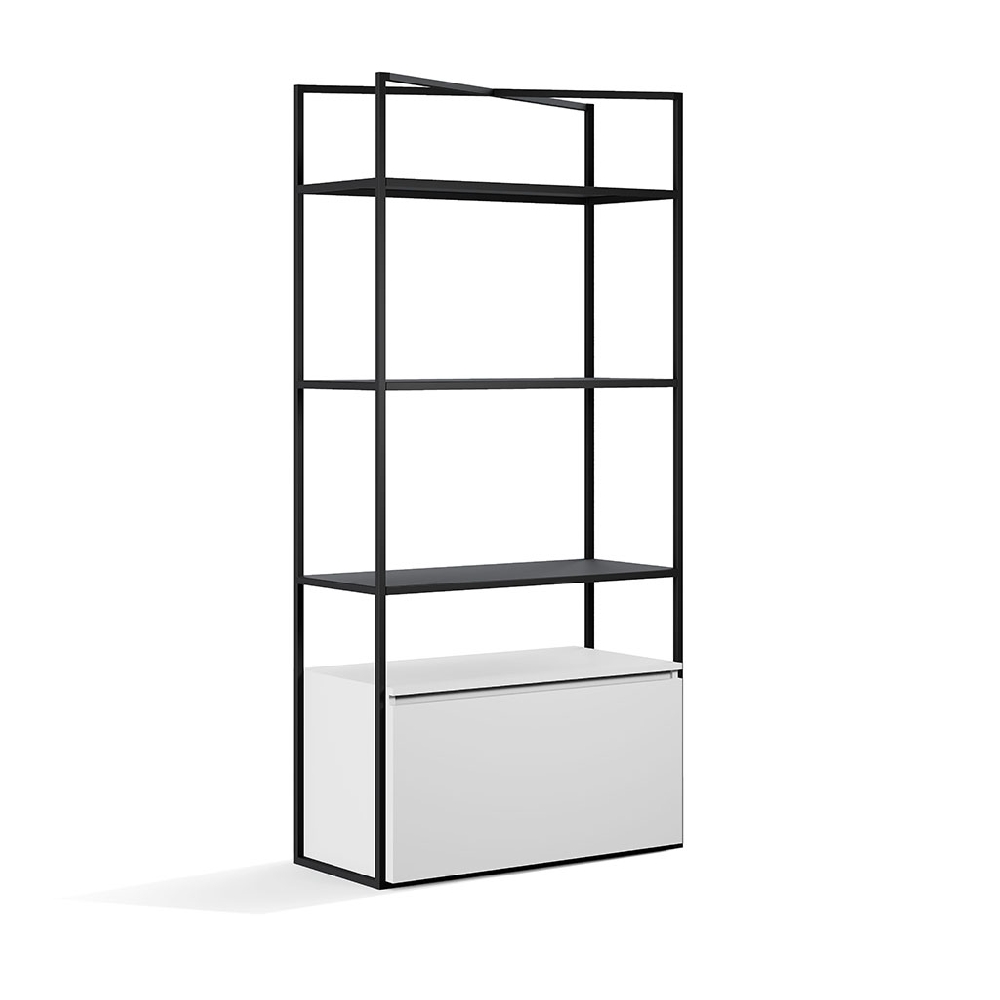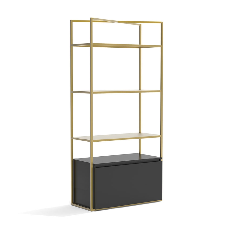 Витрина из металла окрашенного в черный цвет. Витрина оснащена тремя полками из металла и выдвижным ящиком выполненным из ламината.