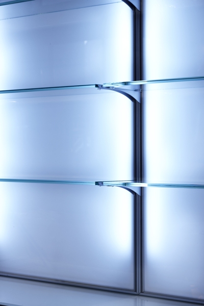Навесная витрина с тремя полками. Каркас витрины выполнен из алюминия, полки из стекла. Витрина оснащена тремя регулируемыми стекляными полками и светодиодной подсветкой. Крепление к стене.