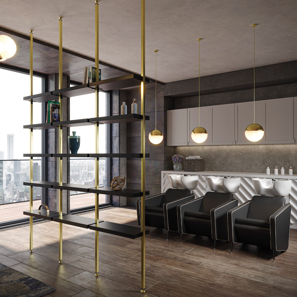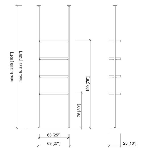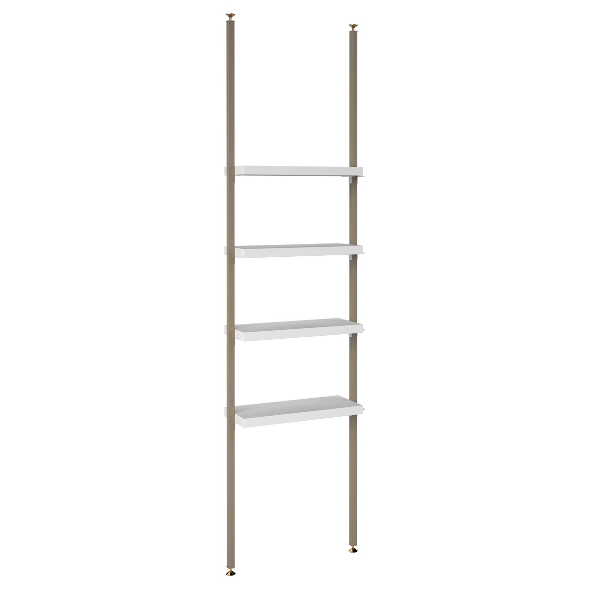 Витрина от пола до потолка. Стойки, покрытые лаком грязевого цвета QL или матово-черного. Витрина оснащена четырьмя полочками. Полки выполнены из глянцево-белого или глянцево-черного акрилового ламината.