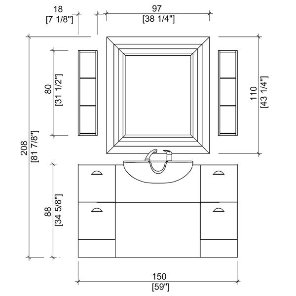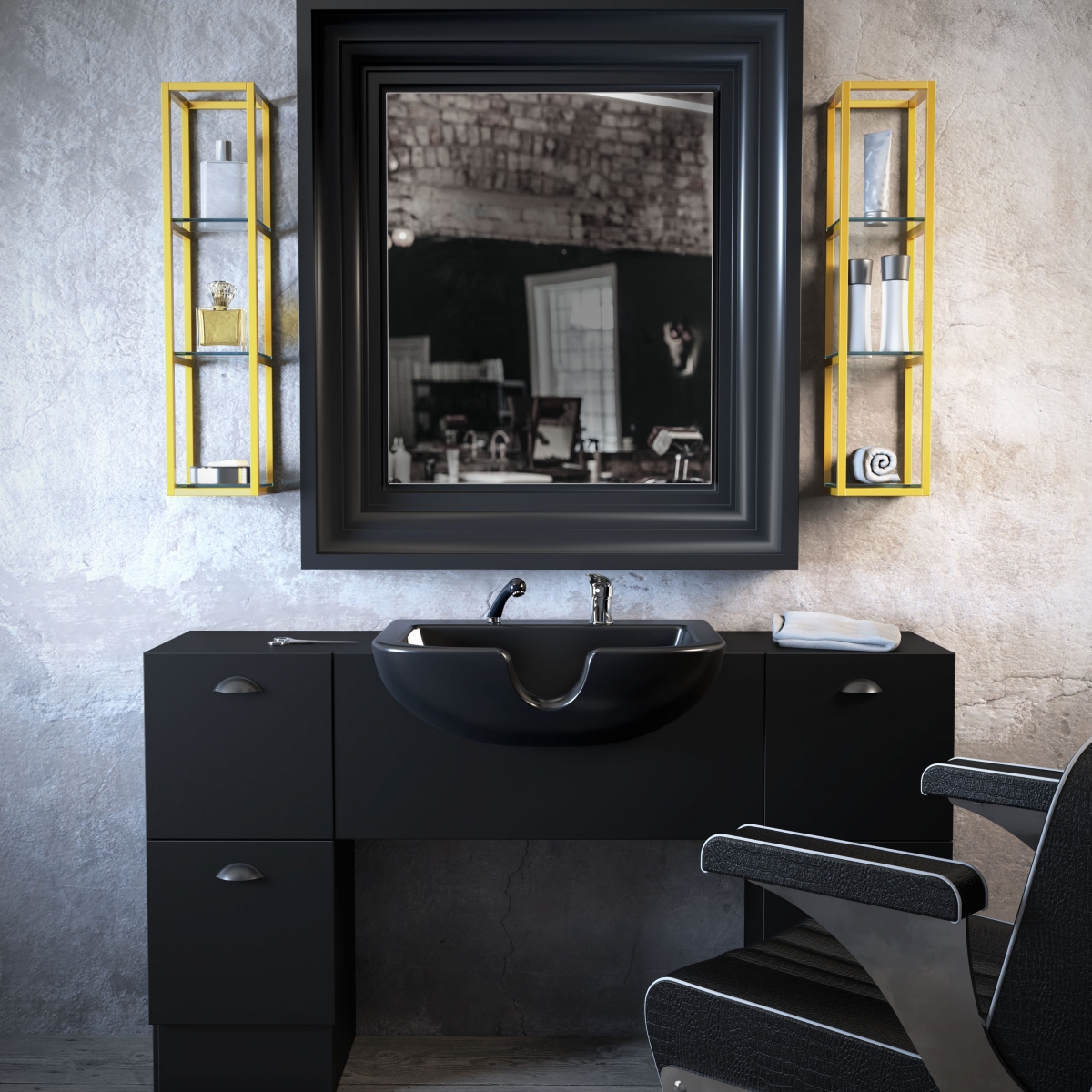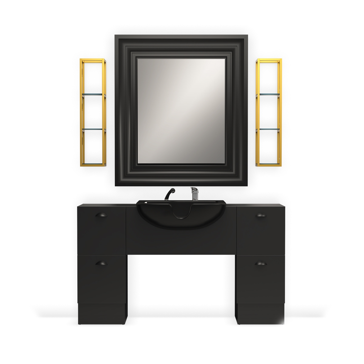Мужской рабочий туалет BACKINBLACK 1P на одно рабочее место. Рабочий туалет оснащен навесным зеркалом в классическом стиле, двумя навесными открытыми консолями и рабочим столом с ингрированной в столешницу черной керамической раковиной с комплектом смесителя. Также рабочий стол имеет 4 выдвижных ящика для хранения инструментов. Стол может быть выполнен из ламината белого матового, черного матового цвета или в цвете дерева (OLMO CANNELLA). Столешница и полки в консолях выполнены в материале COLORPACK белого или черного цвета. Навесные консоли выполнены из металла черного или золотого цвета. Зеркало имеет массивную раму в классическом стиле окрашеную в черный матовый цвет. Крепление зеркала и боковых консолей — к стене.
