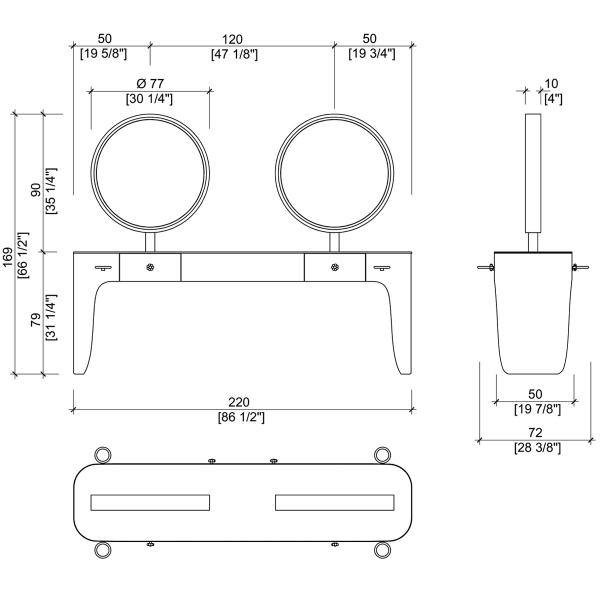 Двусторонний рабочий туалет на четыре рабочих места. Окантовка (торец) зеркал имеет декоративную отделку из искусственной кожи высшего качества LOTUS SKAI (Белый WHITE, черный BLACK или розовый PINK). Стол рабочего туалета оснащен выдвижными ящиками и держателями для фена.