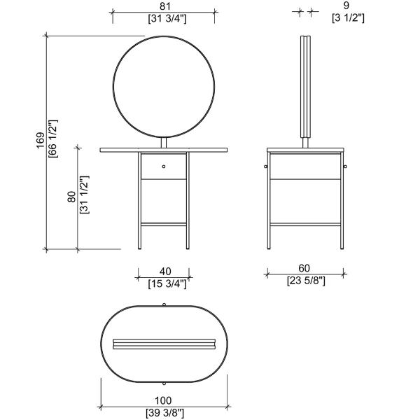 Рабочий туалет на два места. Рабочий туалет оснащен зеркалом округлой формы и рабочим столиком в черном цвете. Рабочий стол оснащен розетками и четырьмя выдвижными ящиками (с каждой стороны). Окантовка зеркал и столешницы выполнена в глянцевом черном или золотом цвете.