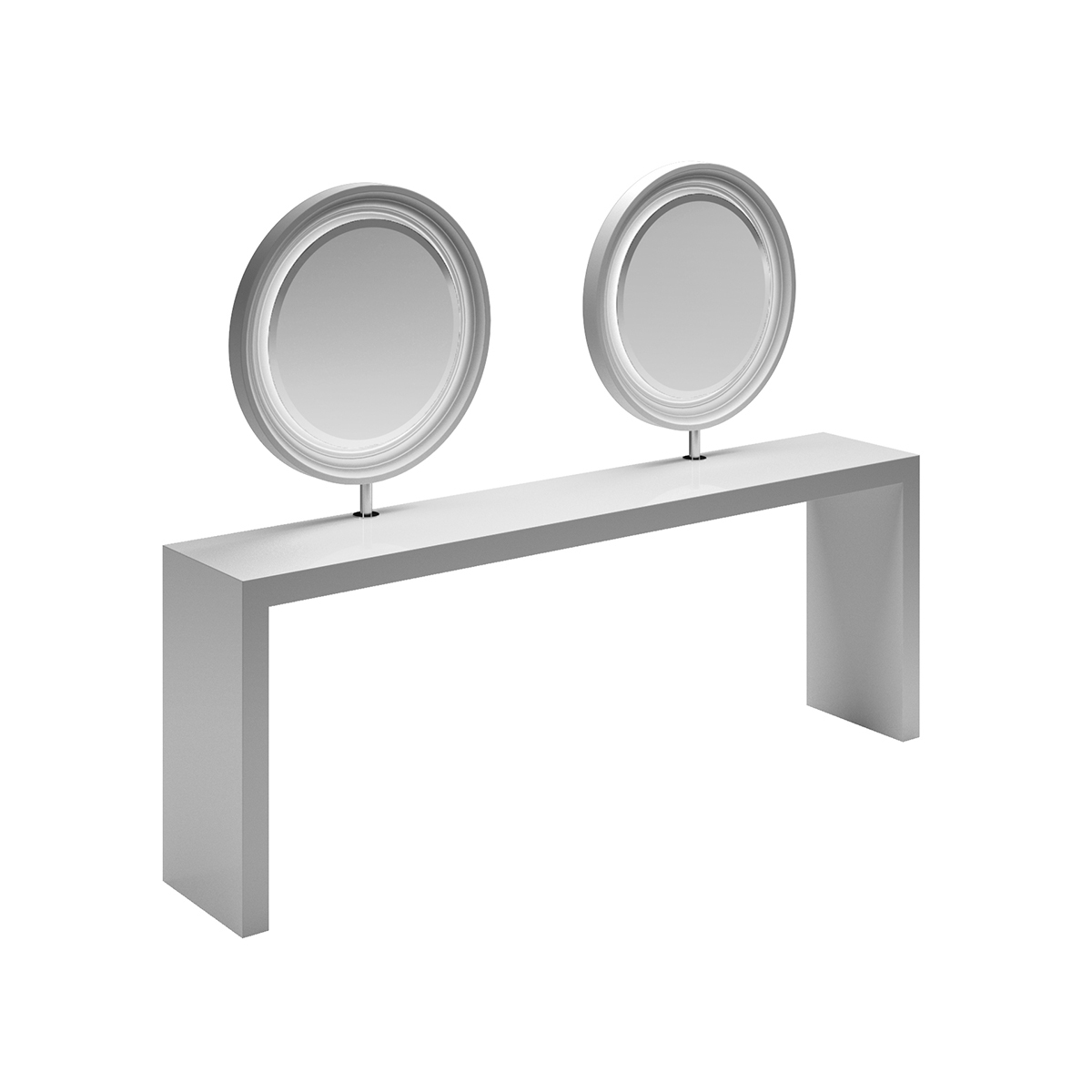 Рабочий туалет на два рабочих места. Рабочий туалет выполнен в ламинате белого цвета. Рабочий туалет оснащен зеркалами округлой формы в декоративной раме. Крепление к стене.