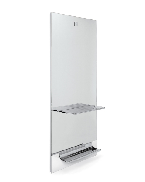 Зеркало парикмахерское. Нижняя часть зеркала выполненна из дерева. Зеркало оснащено металлической хромированной столешницей и подставкой под ноги. Крепление к стене.