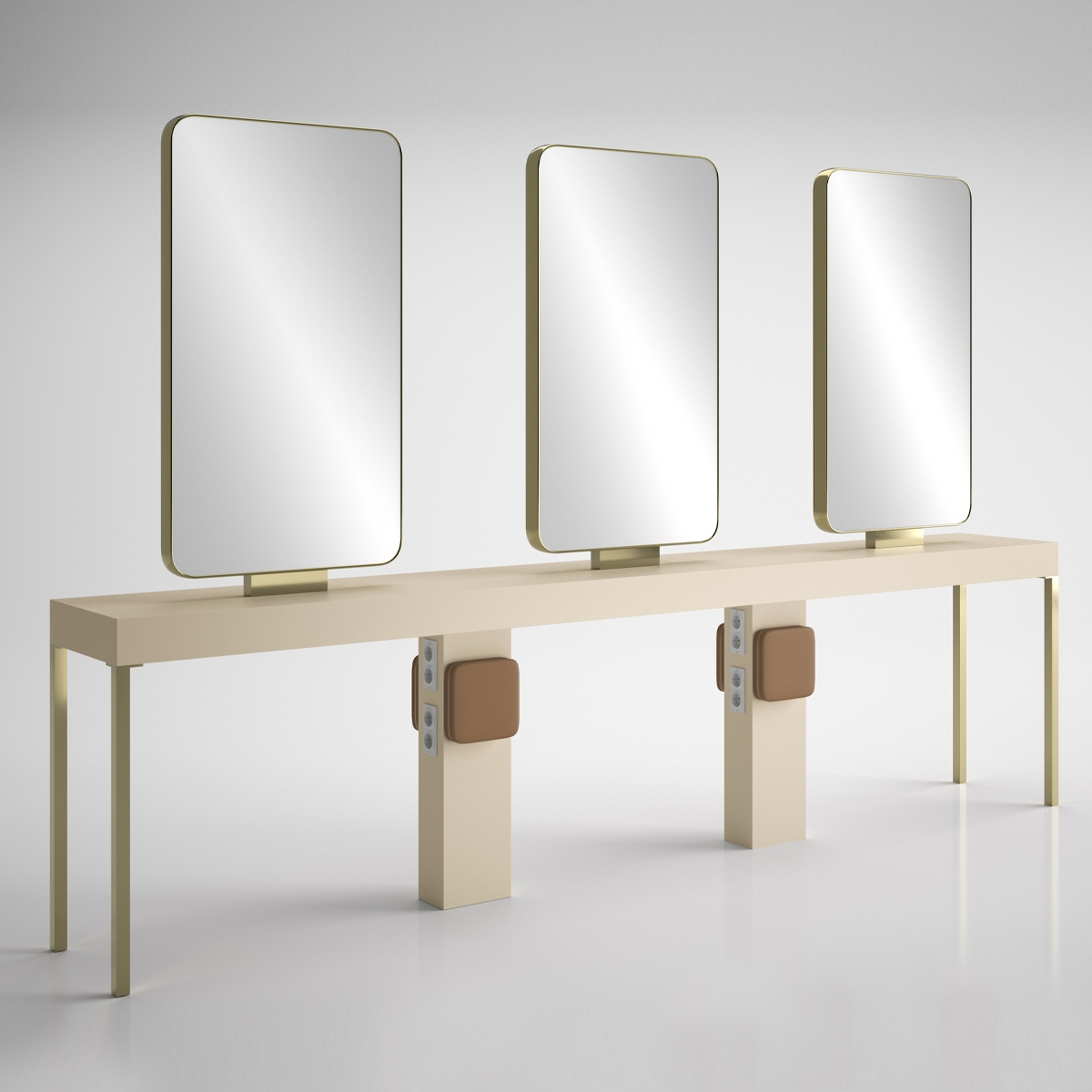 Металлические ножки и окантовка зеркал рабочего туалета выполнены в золотом, хромированном или черном цвете. Рабочий стол выполнен в ламинате.