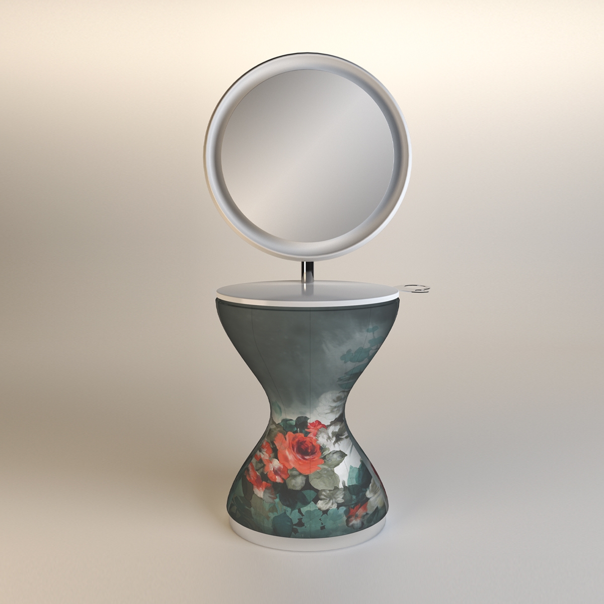 Рабочий туалет на одно рабочее место со съемным тканевым покрытием. Рабочий туалет оснащен зеркалом со светодиодной подсветкой LED, белой столешницей с выдвижными фенодержателями.