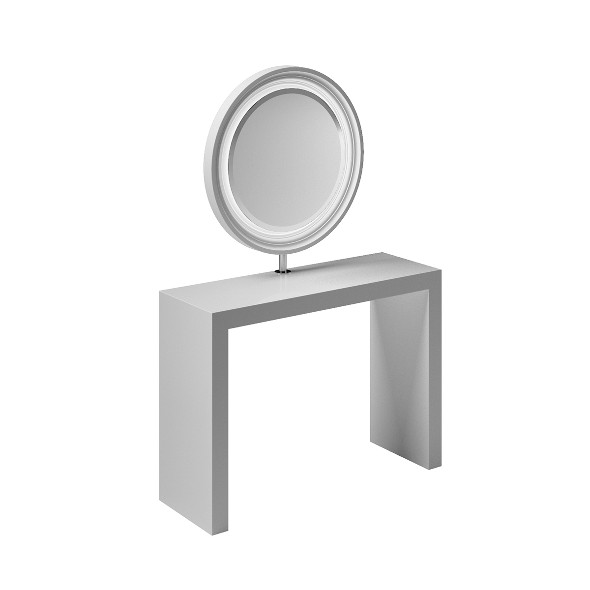 Рабочий туалет на одно рабочее место. Рабочий туалет выполнен в ламинате белого цвета. Рабочий туалет оснащен зеркалом округлой формы в декоративной раме. Крепление к стене.