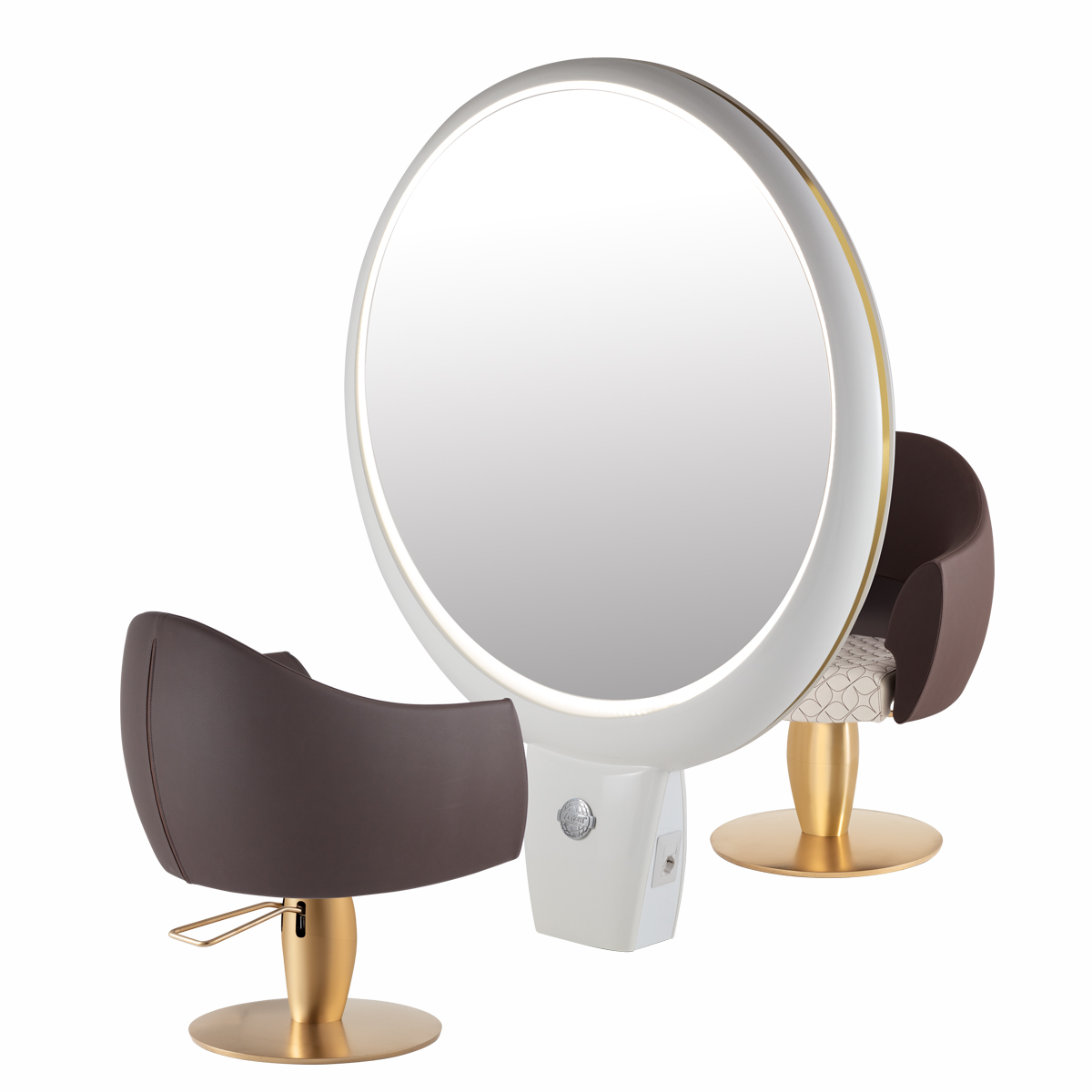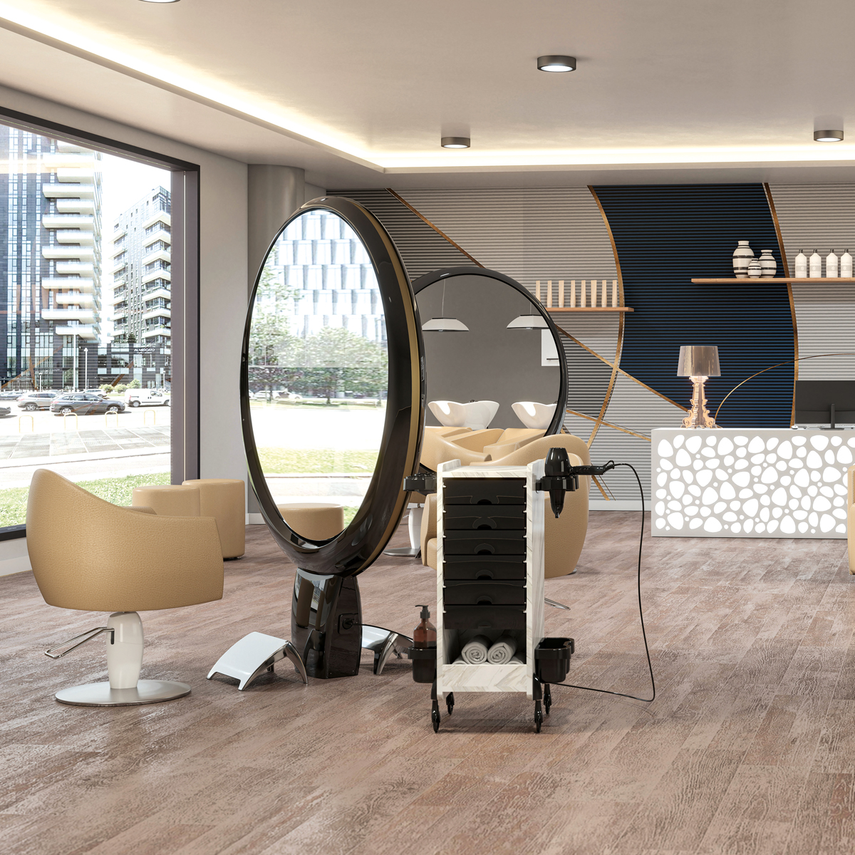 Зеркало парикмахерское двустороннее в декоративной раме. Каркас выполнен из пластика белого цвета. Крепление к полу.