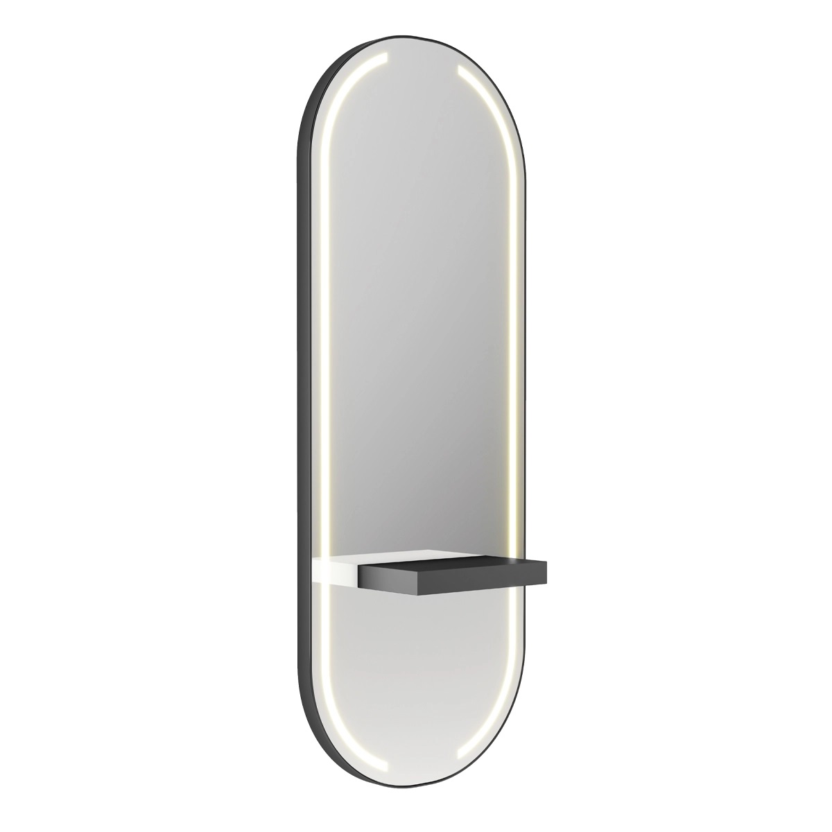 Рабочий туалет овальной формы. Рабочий туалет оснащен столешницей из глянцевого белого или черного акрила. Окантовка рамки выполнена в глянцевом золотом, хромированном или черном цвете. Зеркало оснащено лицевой светодиодной подсветкой. Крепление к стене.