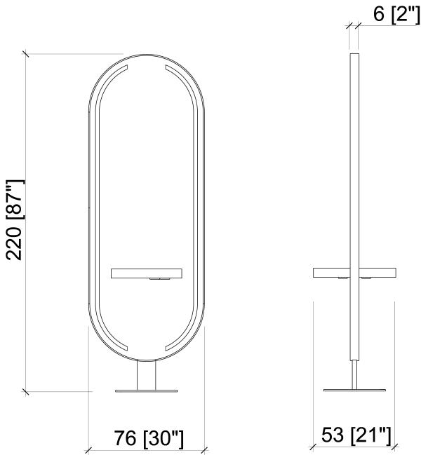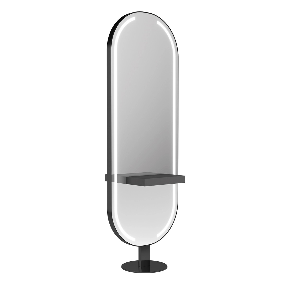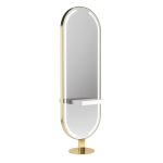 Двусторонний рабочий туалет на два рабочих места. Рабочий туалет оснащен столешницами из глянцевого белого или черного акрила, четырьмя (по две с каждой стороны) розетками под столешницами, а также металлическим основанием округлой формы. Зеркало оснащено лицевой светодиодной подсветкой. Окантовка рамки и основание выполнены в глянцевом золотом, хромированном или черном цвете. Крепление к полу.