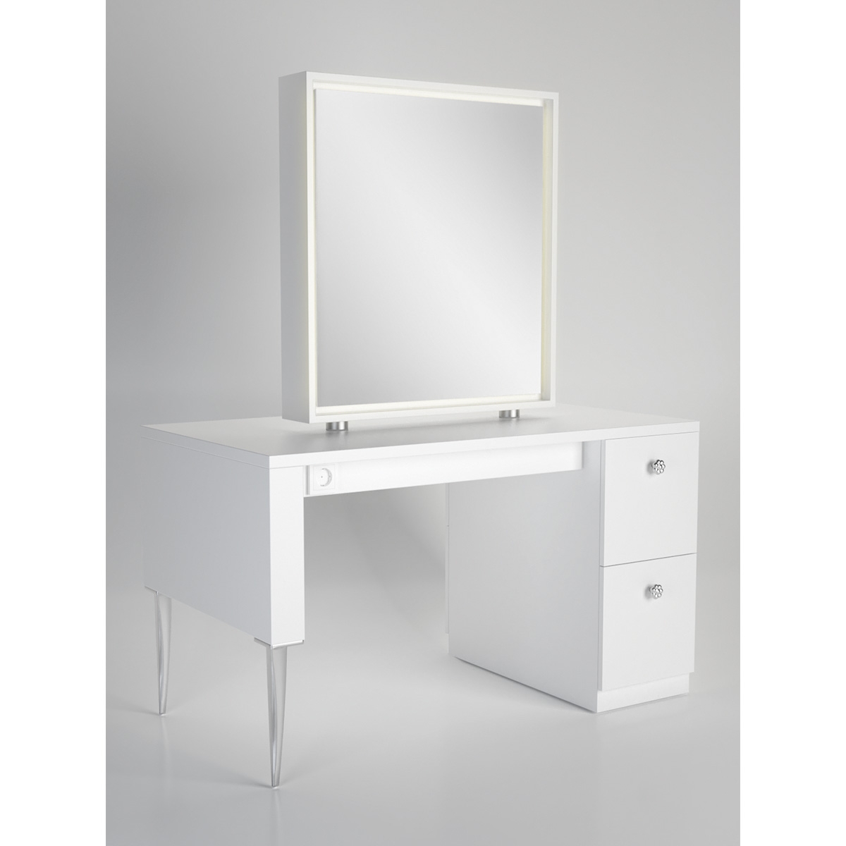 Рабочий туалет на два рабочих места. Рабочий туалет оснащен зеркалом прямоугольной формы и столом на алюминиевых ножках. Рабочий стол оснащен розетками и четырьмя выдвижными ящиками.
