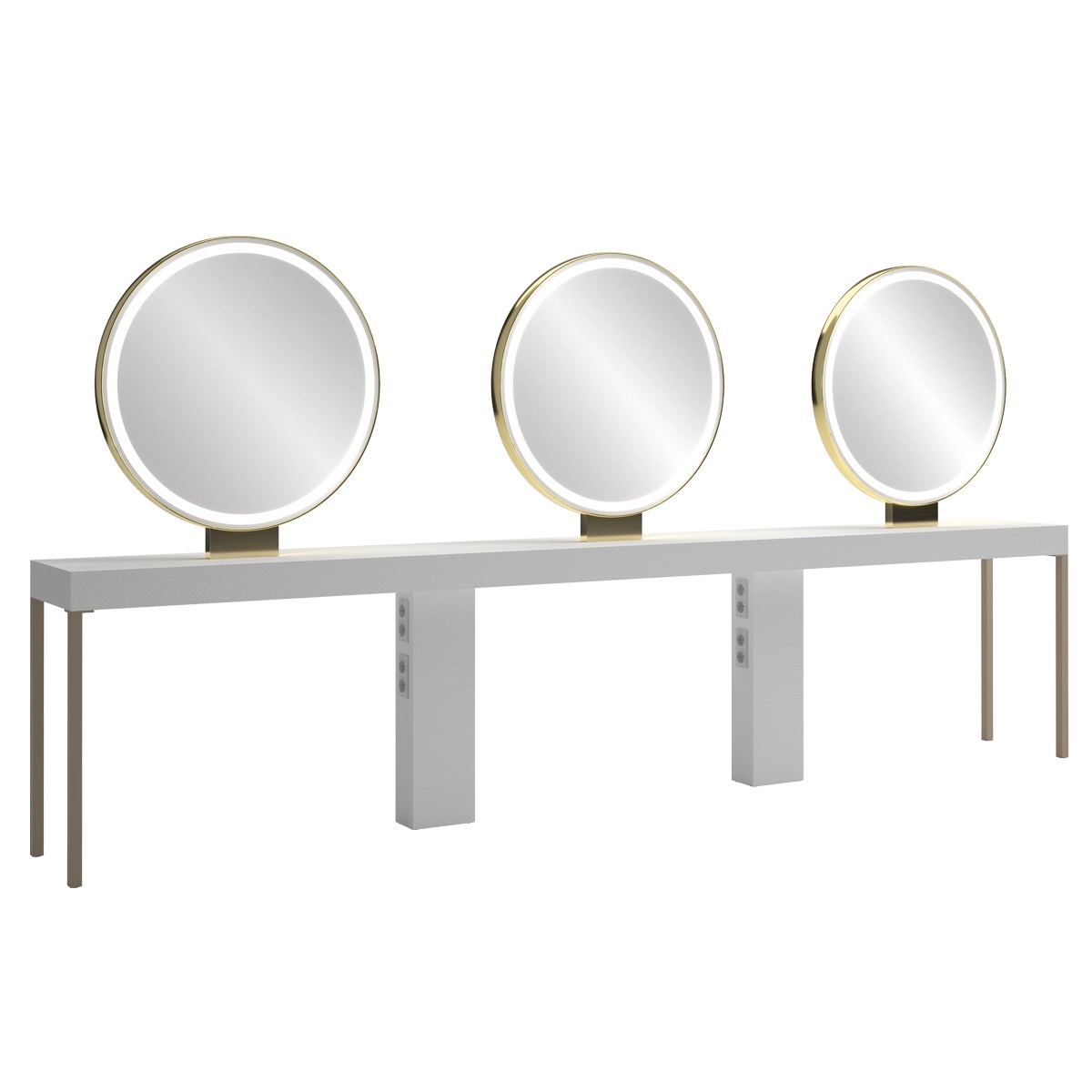 Рабочий туалет на шесть рабочих мест. Рабочий туалет оснащен зеркалами округлой формы, рабочим столиком, а также интегрированными розетками. Рабочий стол выполнен в ламинате белого цвета QL. Окантовка рамки зеркал выполнены в глянцевом золотом, хромированном или черном цвете. Зеркала оснащены лицевой светодиодной подсветкой. Ножки рабочего стола выполнены в цвете грязи QL MUD или черный матовый.