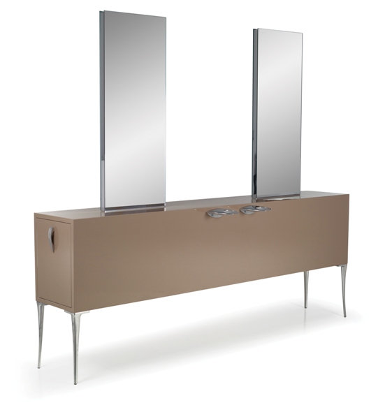 Двусторонний рабочий туалет на четыре рабочих места. Корпус рабочего туалета выполнена из дерева, ламината или акрила, по выбору клиента. Рабочий туалет оснащен фенодержателями и металлическими ножками.