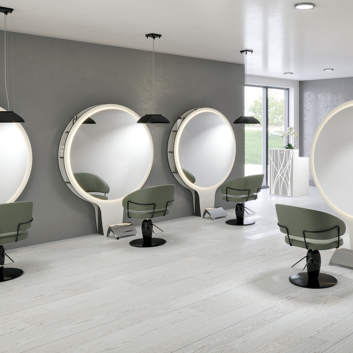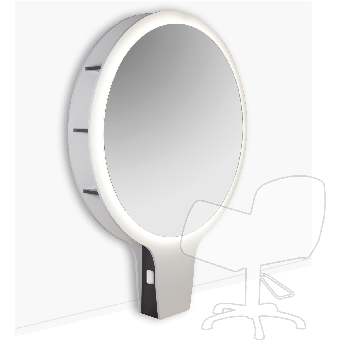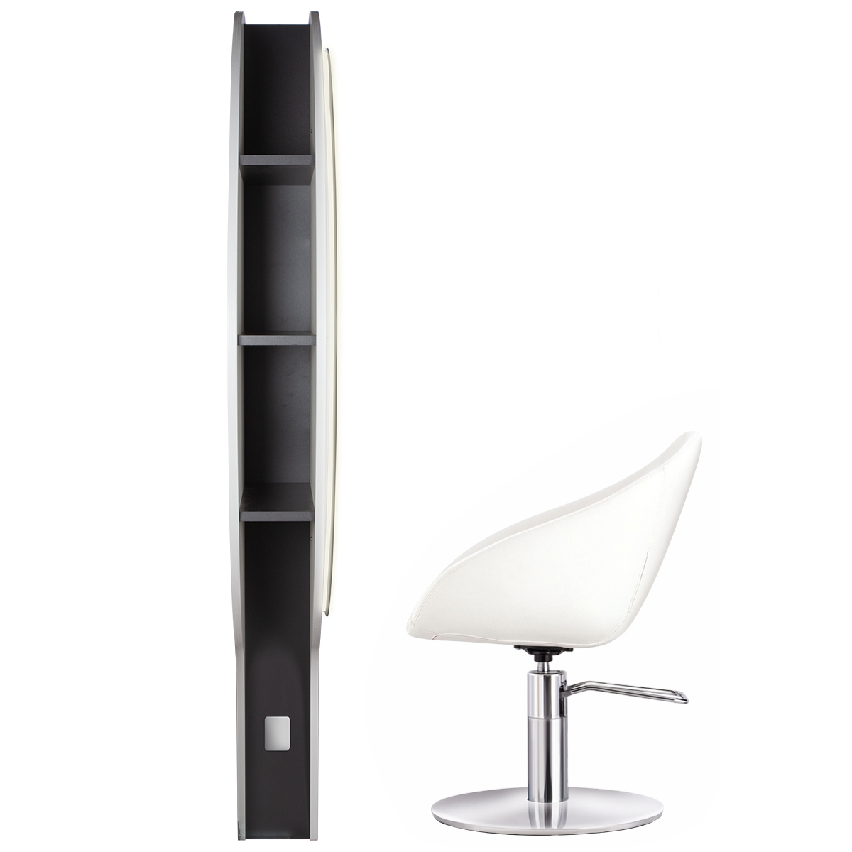 Зеркало парикмахерское одностороннее с открытыми секциями. Зеркало оснащено открытыми нишами. Каркас выполнен в ламинате. Крепление к стене.