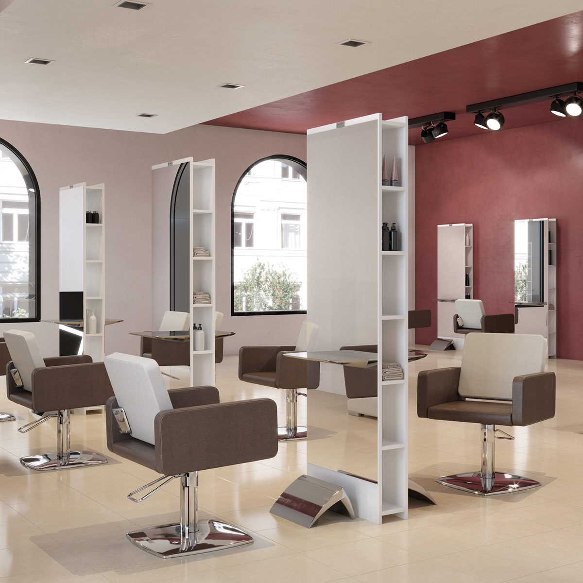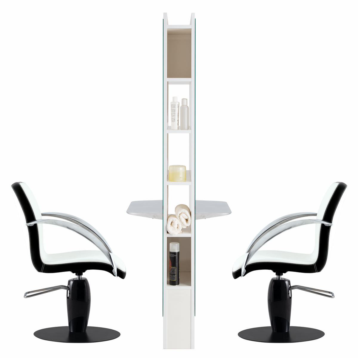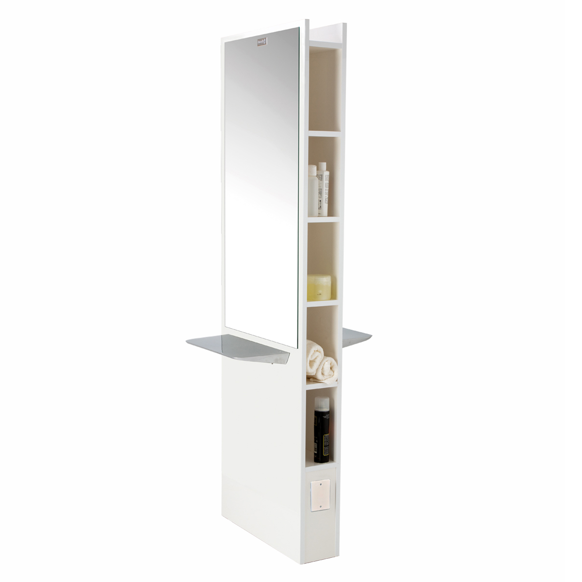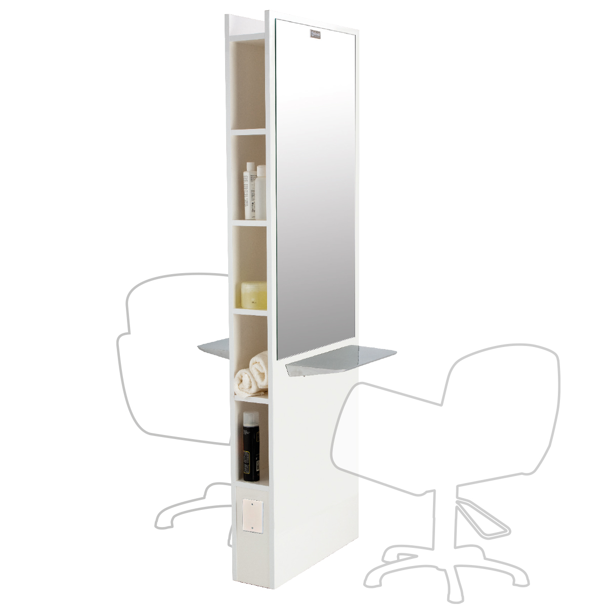 Зеркало парикмахерское двустороннее с открытыми секциями. Зеркало оснащено открытыми нишами и хромированными столешницами. Каркас выполнен в ламинате. Крепление к полу.